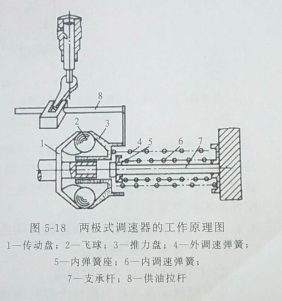 圖5-18所示為一種發(fā)電機(jī)組兩極式調(diào)速器的工作原理圖。這種調(diào)速器可在兩種轉(zhuǎn)速(低速和標(biāo)定轉(zhuǎn)速)下起作用。其主要特點是調(diào)速彈簧由兩根組成,外調(diào)速彈簧4較長,但其剛性較弱;內(nèi)調(diào)速彈簧6較短,但剛性強(qiáng)。外彈簧的預(yù)緊力小而內(nèi)彈簧的預(yù)緊力大在未工作時兩彈簧之間保持一定距離。此外,柴油發(fā)電機(jī)組供油拉桿8既可由調(diào)速器操縱,又可由操作者直接控制。